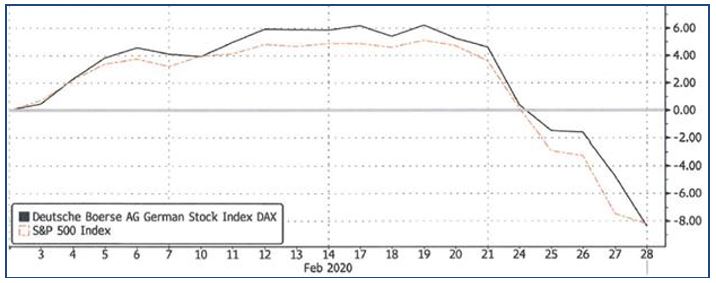 Das Jahr 2020 begann an den Weltbörsen recht freundlich. Der Konjunkturrückgang fiel zunächst einmal weniger drastisch aus als befürchtet, und die offiziell so genannte „erste Phase“ eines Kompromisses zwischen den USA und China weckte Hoffnungen auf eine Deeskalation der Spannungen, die sich zwischen beiden Mächten aufgebaut hatten. Dann kam der Virus, mit ihm Unsicherheit, und dann ein Absturz der Kurse. Die folgende Graphik beschränkt sich auf den Februar, und gibt die Kursänderungen in Prozenten an.