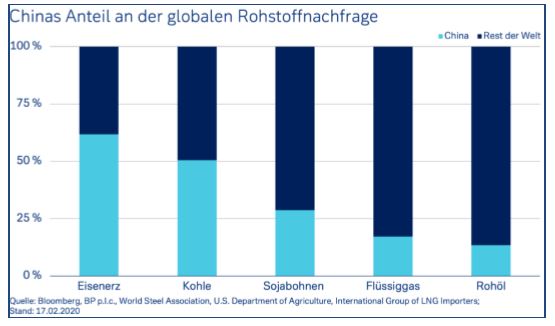 Die Prognose des IWF für das Wirtschaftswachstum des heurigen Jahres in China ist bereits von 6 % auf 5,6 % gesenkt worden. Nach der (chinesischen) Chefanalystin von Alliance Bernstein, die sich die bisher genauesten Prognosen zutraut, sollte ein dreimonatiges Anhalten der Epidemie das chinesische Wachstum um 0,8 verringern, also um doppelt so viel als der IMF annimmt. Und bei einem neunmonatigen Anhalten sollte sich das Wachstum um nicht weniger als 1,9 % verringern. Allein schon wegen der engen Verflechtungen der Weltwirtschaft sind daher auch für etliche weitere Industrienationen Revisionen der Wachstumserwartungen nach unten zu befürchten. Wie die folgende Graphik zeigt, spielt für wichtige Basisprodukte die Nachfrage aus China eine große Rolle und die zu erwartende schwächere Nachfrage wird die Produzenten dieser Produkte belasten:
