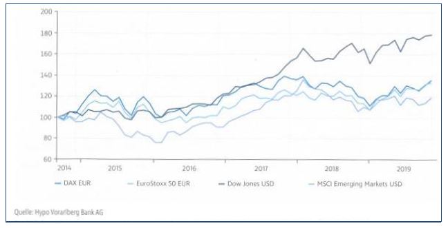 Überhaupt sind die Ergebnisse der Emerging Markets im Moment wenig eindrucksvoll. Die im Weltindex MSCI Emerging Markets vertretenen Unternehmen haben bereits im 4. Quartal 2019 deutlich schwächer abgeschnitten als erhofft. Für diese Unternehmen wurde vorher ein aggregiertes Gewinnwachstum von 16 % bei einer Umsatzsteigerung von 4 % erwartet, geworden sind es ein Gewinnwachstum von 3,1 % bei einem enttäuschenden Umsatzwachstum von 0,2 %. Emerging Markets bieten nach wie vor eine Fülle von Anlagemöglichkeiten. Aber man sollte sehr selektiv vorgehen. Denn insgesamt hinken die Kurse der wichtigsten Unternehmen der Emerging Markets schon seit längerem denen der klassischen Industriestaaten nach, wie der nachstehende Indexvergleich zeigt.